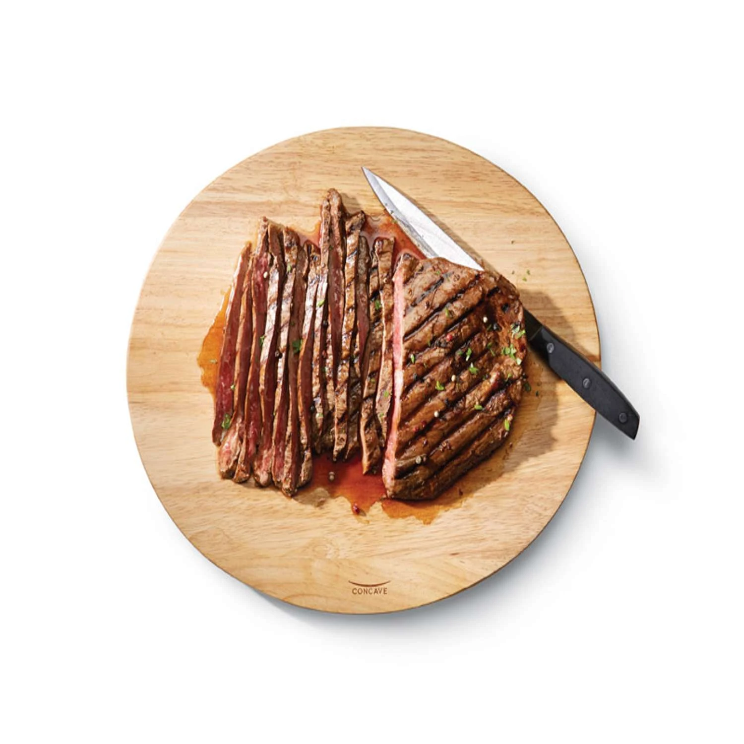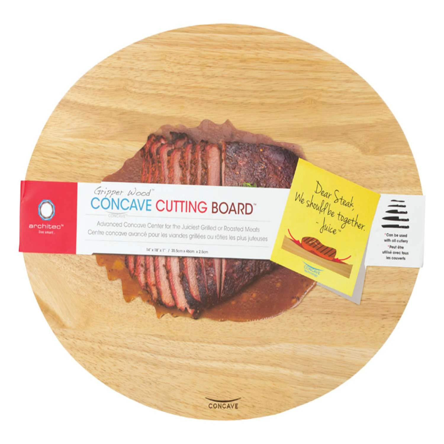 Our Architec Cutting boards are made of rubberwood, a sustainable tropical hardwood known for its neutral color and durability. The patented Concave design features a gradual concave surface that keeps the juice where it belongs–with the meat, making it the favorite of all grilling enthusiasts. The meticulously designed surface retains over 1 cup of liquid on the surface, and our patented Gripper feet provide a safe, stable, non-slip cutting surface Concave surface allows juice to stay with meats and/or fruits Gripperwood feet to prevent sliding on flat surface Easy to use