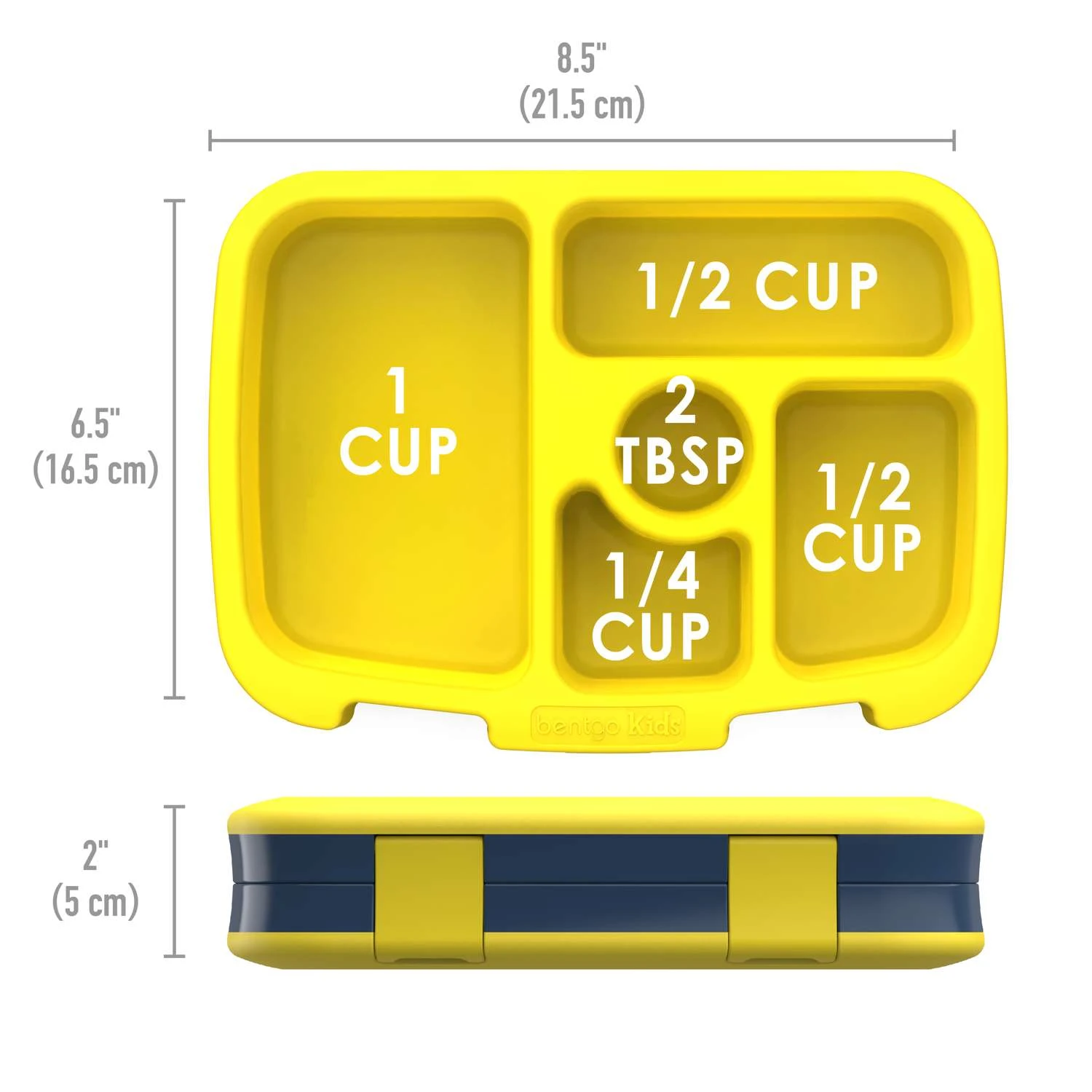 Give your childs lunchbox a fun and stylish makeover with a bold, new pattern from Bentgo Kids. This one-of-a-kind, leak-proof Bentgo Kids lunch box features 5 compartments for fruit, veggies, dip, an entree and dessert. With so many perfectly portioned compartments, this Bentgo box for kids organically inspires parents to pack a more wholesome, balanced lunch for growing kids who are always on the go. This bento lunch box for kids features drop-proof, rubber-coated edges and a sturdy design that is ideal for active kids on the go. It keeps meals and snacks fresh and mess-free during transport and includes 2 kid-friendly latches that are easy for small hands to open and close. Our Bentgo Kids Prints come in adorable designs for the perfect lunch box for girls or boys. Although the Bentgo Kids Prints lunch box is recommended for children ages 3-7, it can be used by teens and adults looking to pack a portion-controlled lunch. Microwave safe tray the removable tray can be placed in the microwave for up to 3 minutes to reheat food Dishwasher safe tray the easy-to-clean compartment tray in our kids lunch box is top-shelf dishwasher safe BPA-free materials Bentgo kids prints lunch boxes are made of FDA food grade materials without BPA, vinyl, lead or PVC Compartment capacity left 1 cup; back 1/2 cup; right 1/2 cup; front 1/4 cup and sauce 2 tbsp