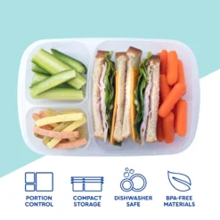 EasyLunchboxes makes eating a variety of foods fun and easy. Our 3-Compartment Lunch Containers are the perfect size for a full lunch portion of your favorite meal. They can easily fit meals such as sandwiches, fruit and chips or a salad with veggies and a snack. Each bento box set comes with 4 containers and 4 lids to make it easy to prep meals for the week ahead. Fast pack – quickly organize and pack meals Easy clean – just add to the dishwasher For all ages – great for school, work or travel BPA free – made with food safe materials Durable – long lasting quality
