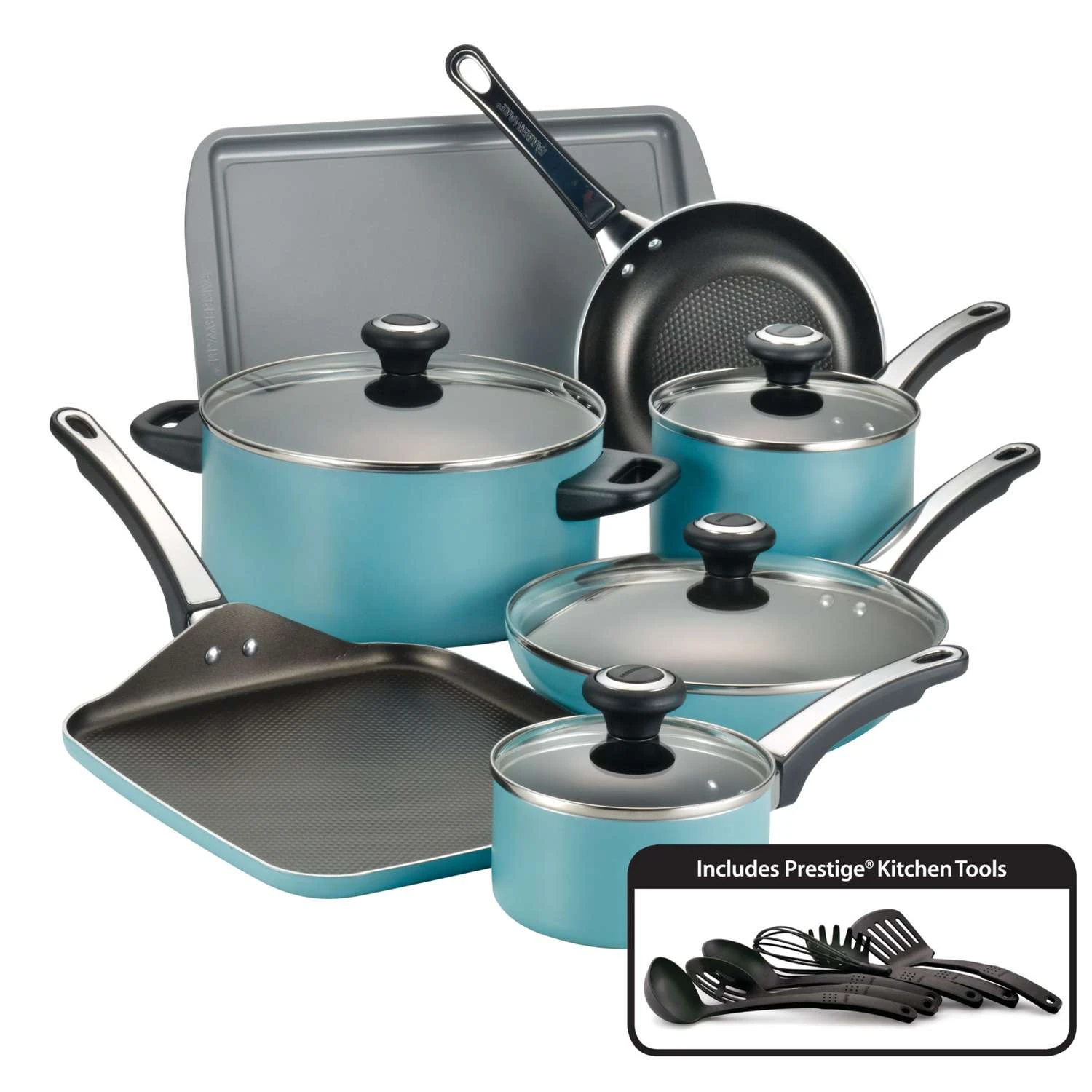 Farberware has brought performance, convenience and reliability to countless kitchens for over a century and this cookware set continues that tradition for a new generation. Crafted from heavy-duty aluminum that heats evenly, the covered saucepans and Dutch oven feature long-lasting nonstick for effortless food release and easy cleanup. Both skillets and the griddle boast the unique dimpled surface of the SmartGlide Nonstick System with top-quality nonstick which improves the nonstick’s durability and creates air pockets that transfer heat to food quickly. Choose from six convenient Prestige nylon kitchen tools to flip pancakes on the griddle, stir marinara in a saucepan or serve a delicious stew from the Dutch oven. Double-riveted handles on the cookware offer a confident grip and shatter-resistant glass lids seal in heat and moisture. This product contains (Este producto contiene) Fluoropolymer, PTFE, FEP, PFA (PFAS), Aluminum. For more information on PFAS or chemicals in this product, visit (Para obtener mas informacion sobre PFAS o productos quimicos en este producto, visite) https://farberwarecookware.com/pages/product-disclosures. The cookware pieces feature long-lasting nonstick for effortless food release and easy cleanup The skillets and griddle also boast the unique dimpled surface of the SmartGlide(tm) Nonstick System with top-quality nonstick coating The cookwares double-riveted handles offer a confident grip Includes six nylon prestige or cooking tools Shatter-resistant glass lids on the cookware seal in heat and moisture
