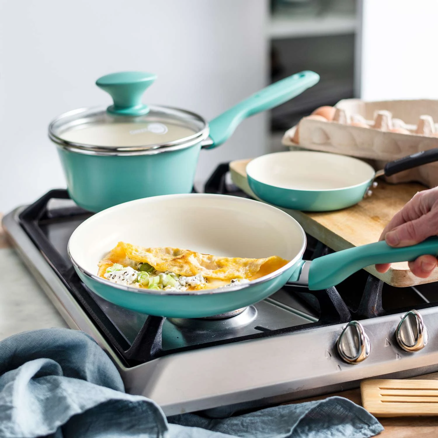 The Rio collection brings a touch of color to your kitchen. The Rio 7 Inch Ceramic Non-Stick Fry Pan in Turquoise adds a subtle touch of elegance, complete with Thermolon healthy ceramic non-stick coating for ease. Rio offers you a tasteful mix of optimal heat distribution and 100% cooking and cleaning convenience. After all, GreenPan quality also extends to the details, from the stay cool Bakelite handle to the heat retaining base. Thermolon minerals ceramic non-stick – perfect frying results using less oil and easy cleaning Manufactured without PFAS and PFOA Metal utensils safe Oven safe up to 350 deg. F Riveted ergonomic stay-cool bakelite handle for secure and comfortable grip Cleaning – handwash recommended A tough, thick base on every frypan prevents warping and is suitable for all stovetops except induction The aluminum body heats quickly to deliver ultra-speedy results