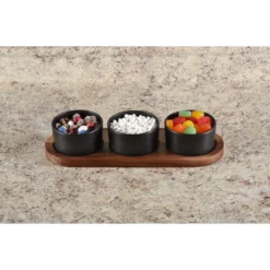 Beautiful set of 3 black ceramic bowls with acacia wood lids sit atop an acacia wood base.Bowl area routed out just enough to prevent unnecessary movement and avoid spillage. Each bowl comes with an acacia wood lid. Ceramic bowl is perfect for dips, salsas, dressings and quesos and is dishwasher safe. Handcrafted from solid acacia wood, a high-quality hardwood great for culinary applications. Cleans up easily by wiping with a damp cloth To enhance the natural beauty of the wood, condition periodically with mineral oil Made from environmentally friendly acacia wood