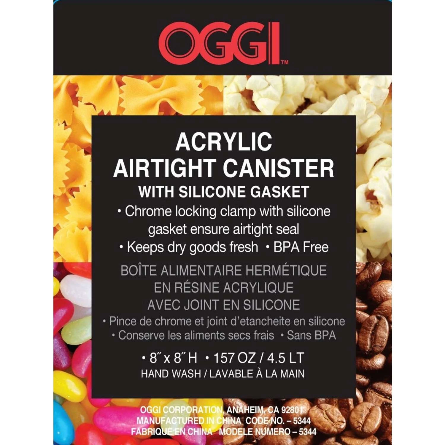 This Oggi Jumbo Canister is made from clear acrylic and can hold a variety of dry goods, such as pasta, rice, cereal and more. It has a 150 Oz. Capacity and is finished with an airtight clamp lid. Acrylic construction Clear color Airtight clamp lid 150 Oz. Crystal clear airtight canisters with clamped lids, silicone gaskets help keep food fresh and moisture free Great for use storing cookies, sugar, flour, spices and other kitchen staples Clear acrylic lid with silicone gaskets to help preserve stored food items Flip-top lid; locking clamp closure Care and cleaning wipe clean with a damp cloth