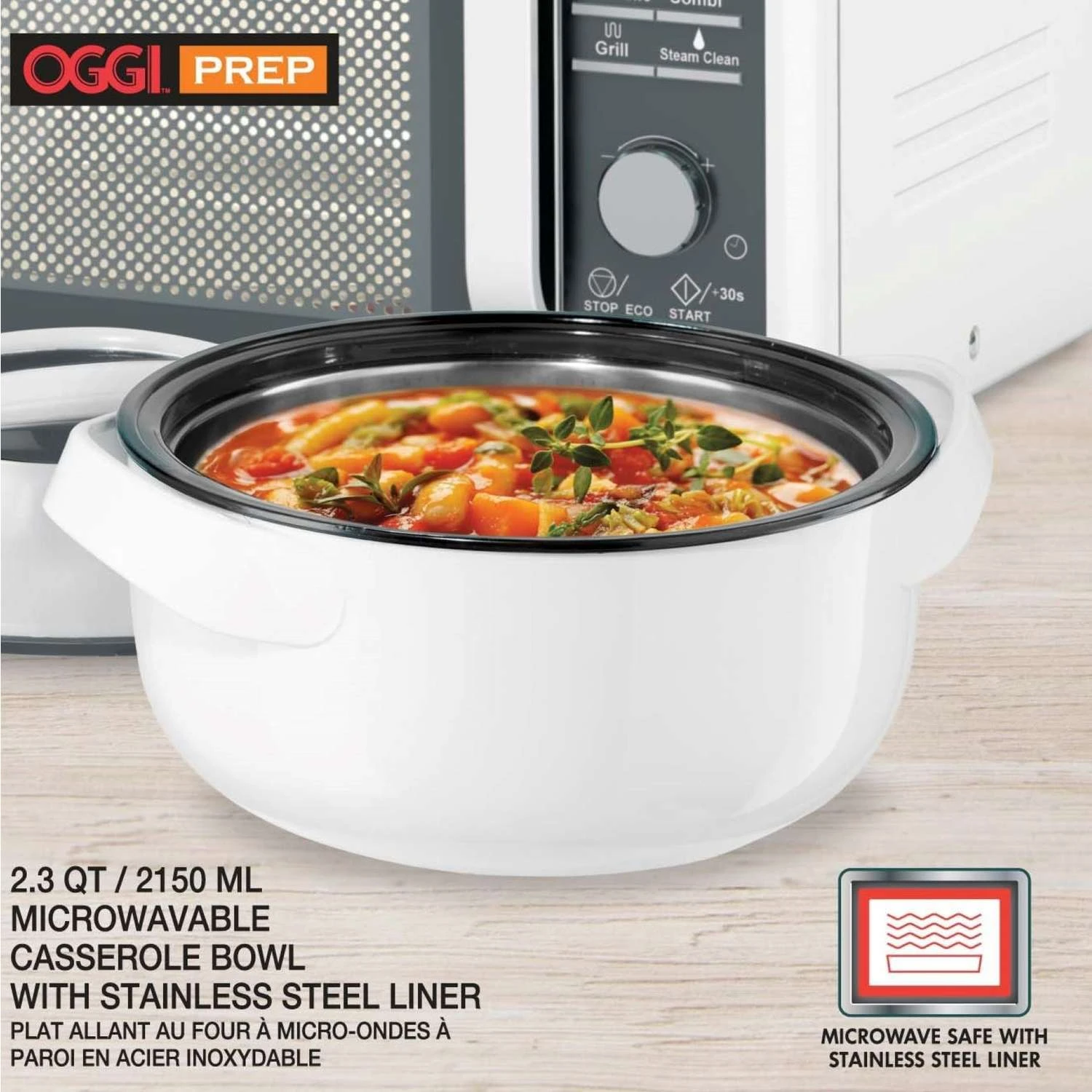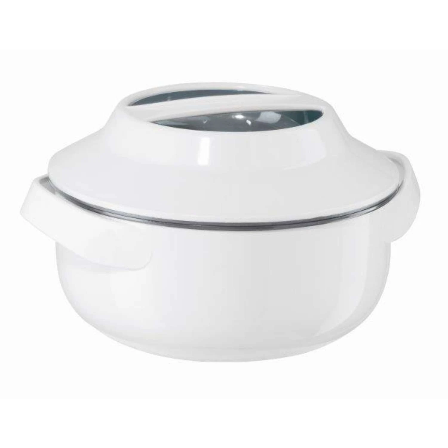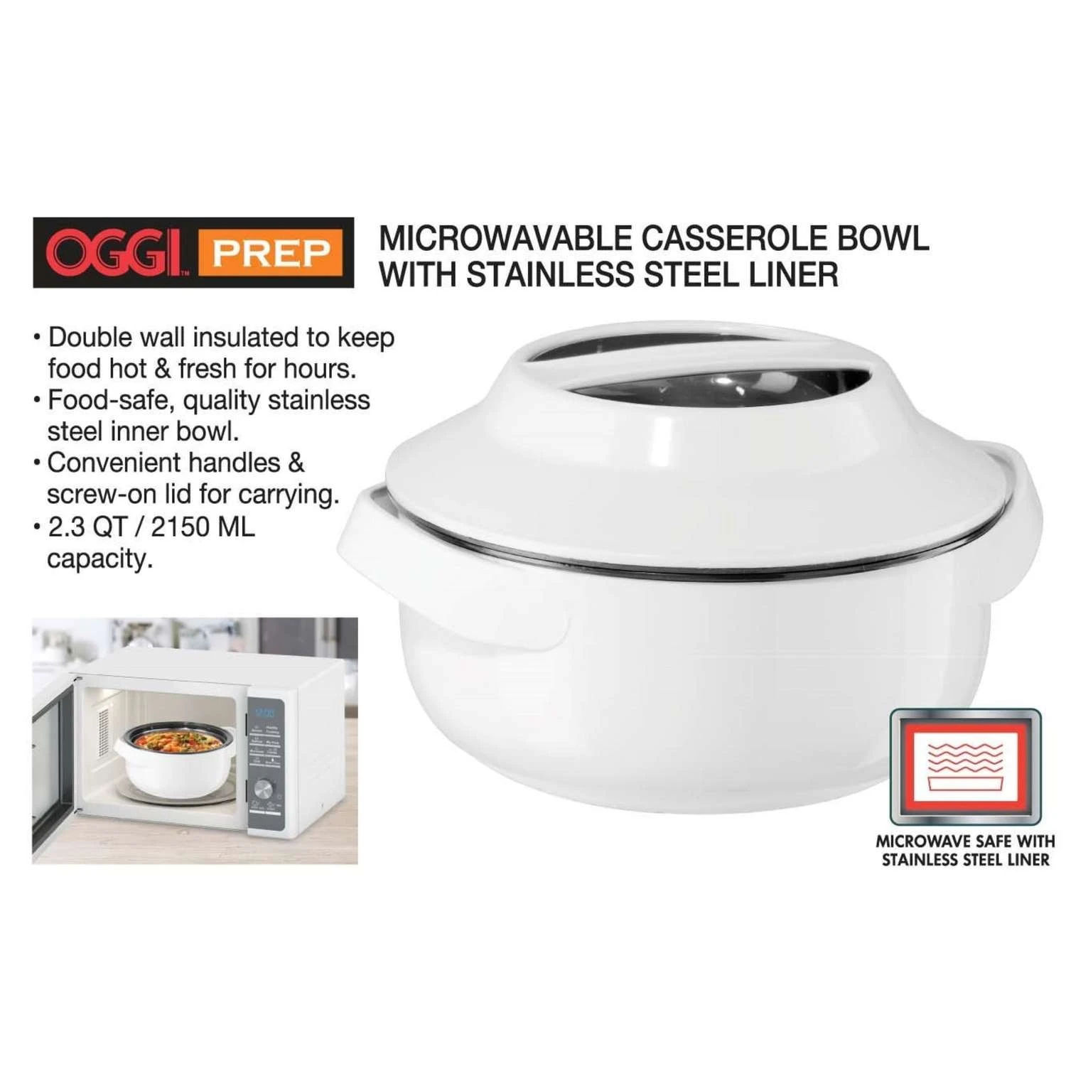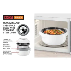 Microwavable Insulated Casserole Bowls with Stainless Steel Liners these uniquely designed and microwavable casserole bowls combine a food safe inner stainless steel bowl, encased in an insulated plastic shell, allowing you to reheat your food safely while keeping your food hot and fresh for hours. Double wall insulated bowl and lid with stainless steel liner Locking lid with carrying handle Outer bowl with easy grip handles