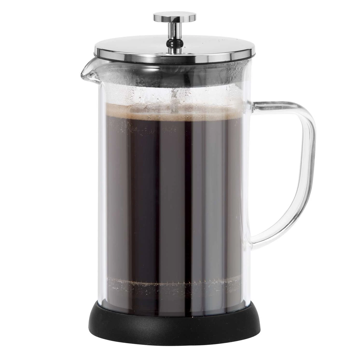 Fuel the barista in you. Enjoy the great flavor and ease of use that comes from making coffee at home with OGGI’s French Press Coffee Maker. The durable borosilicate glass canister sits securely in a textured plastic casing making this French Press an excellent everyday go-to. Borosilicate glass is thermal shock resistant, which allows it to endure extreme temperate changes without breaking. Steep the perfect cup of coffee every time by controlling the temperate and extraction. Making coffee with our French Press coffee is so fresh and flavorful it feels like a luxury. When it is time to pour, the built-in filter reduces ground coffee sediment. The filter also allows loose tea leaves to be brewed in the French Press. Serve straight from this coffee maker and enjoy easy handling with its cool-to-the-touch body. This press features a stainless steel lid and a glass handle. The sleek modern design makes this product a stylish addition to any coffee bar or countertop. The coffee maker has a 3 cup (12oz) capacity. If you put this product in the dishwasher to clean it is recommended that it is placed on the top rack to ensure quality. Taste – control water to grounds ratio to maximize flavor & freshness every morning Heat resistant – pour boiling water into borosilicate glass without fear of cracking Steeper – can be used as hot tea press for loose tea Serve – spout & built-in filter allows for quick clean pour straight from carafe Size – holds 3-4 servings; 8 cup (34oz) capacity