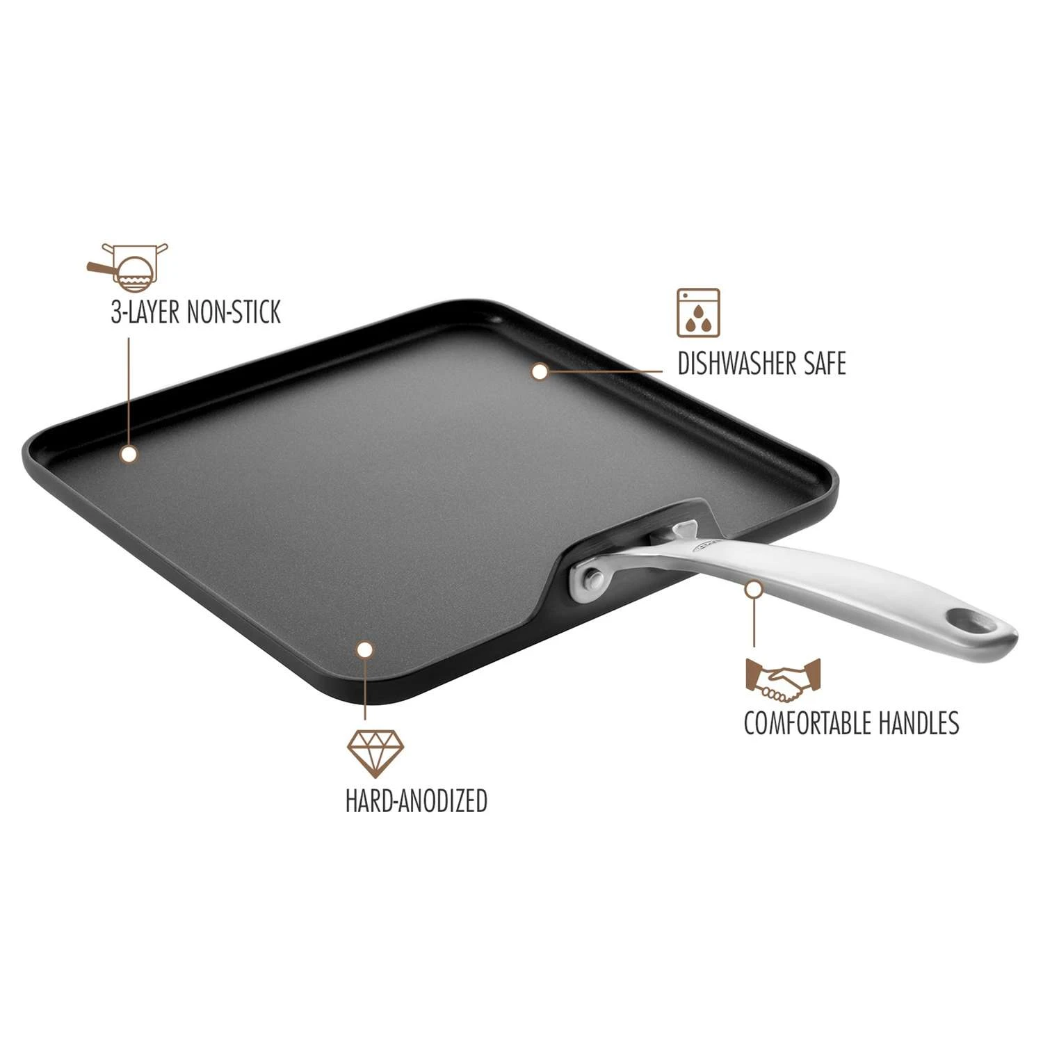 Our Non-Stick Pro Cookware line offers effortless food release and superior heat conduction for even cooking, with a dishwasher-safe coating that’s oven safe up to 430°F/220°C. Contoured, comfortable handles stay cool to the touch and are riveted to provide a secure grip. Hand-anodized – scratch-resistant hard-anodized aluminum ensures superior heat conduction and even cooking 3-layer German-engineered, PFOA-free, non-stick coating Unique rolled edges designed for drip free pouring of sauces, reductions and more Riveted stainless steel handle wrapped in heat-resistant silicone provide a comfortable grip for a secure hold Superior non-stick performance for frying large portions