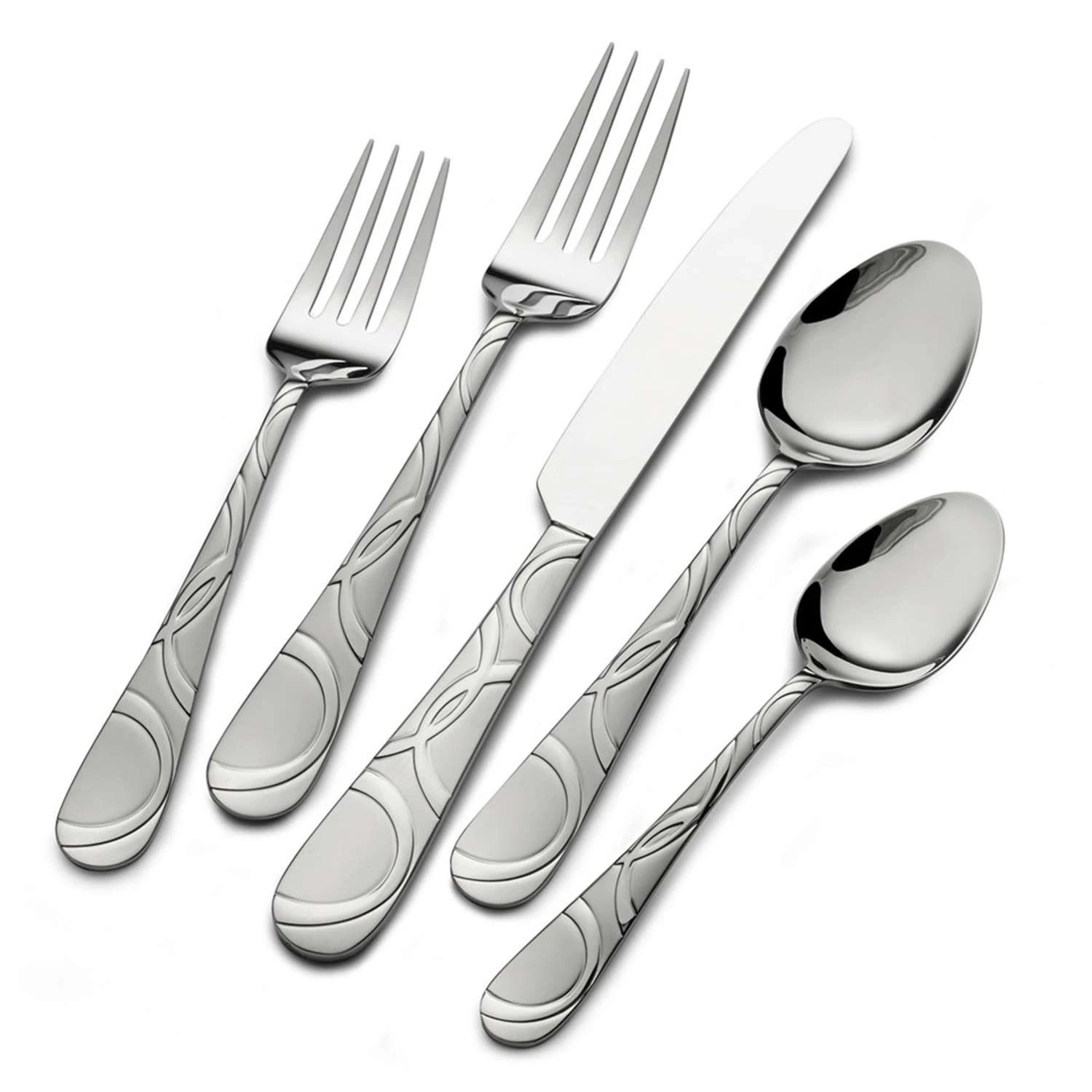 Pfaltzgraff Everyday garland frost flatware set features a fun swirl pattern on the handle with a satin finish that will add a unique look to your table. Constructed of superior quality 18/0 stainless steel, this set will stand up to the rigors of everyday use. 20 piece flatware set, service for four, includes (4) each: dinner fork, salad fork, dinner knife, dinner spoon, teaspoon. Dishwasher safe. Crafted of durable 18/0 stainless steel. 20 piece flatware set. Dishwasher safe.