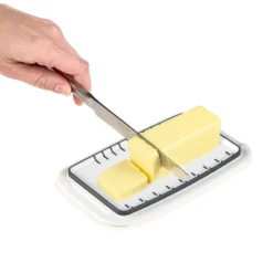 Keep your butter safe with the Prepworks by Progressive Butter Keeper. It has a clear lid with a silicone seal on the base that creates an air-tight seal that will keep butter fresh longer. It also features measurement markings for both short and long sticks. Measurement markings for both short and long sticks of butter up to 8 Tbsp Silicone seal keeps butter fresh longer Patented