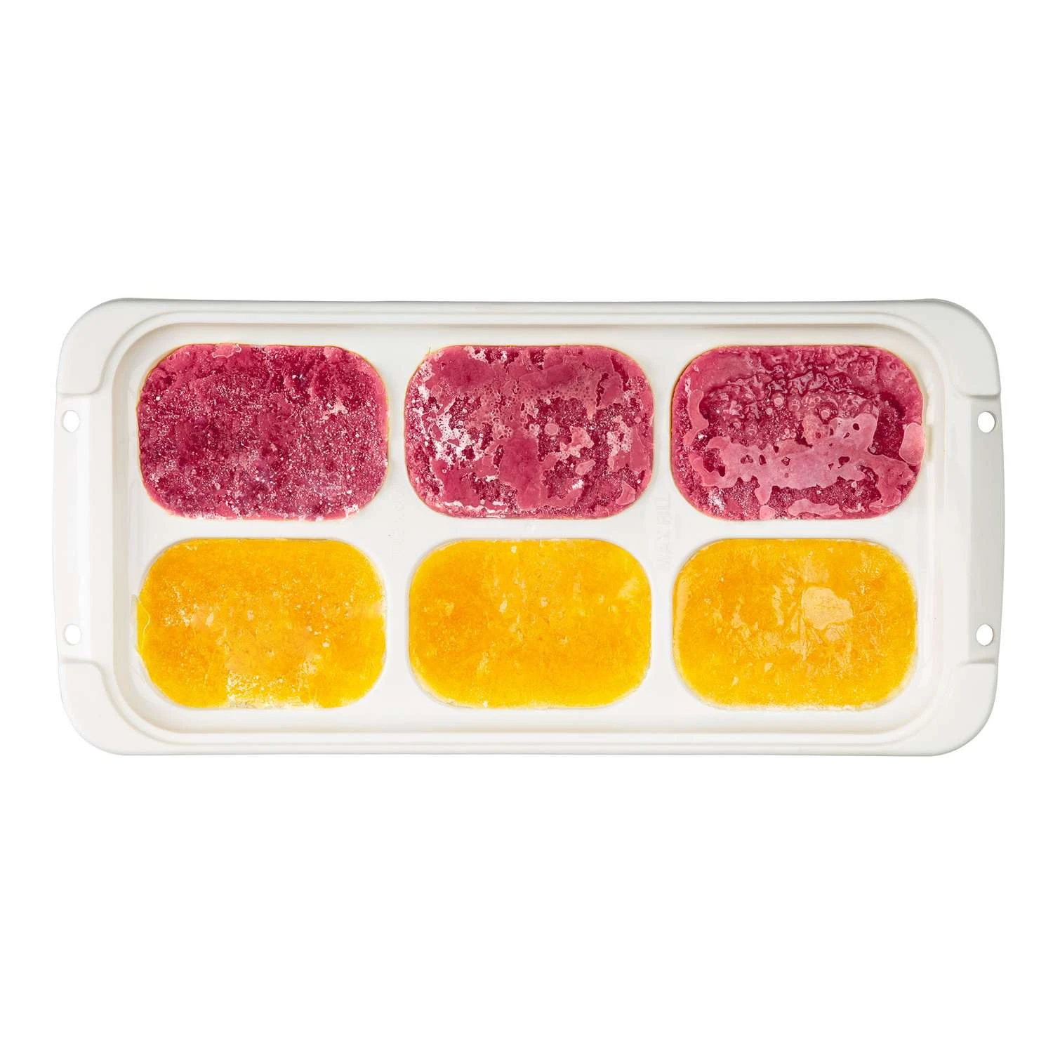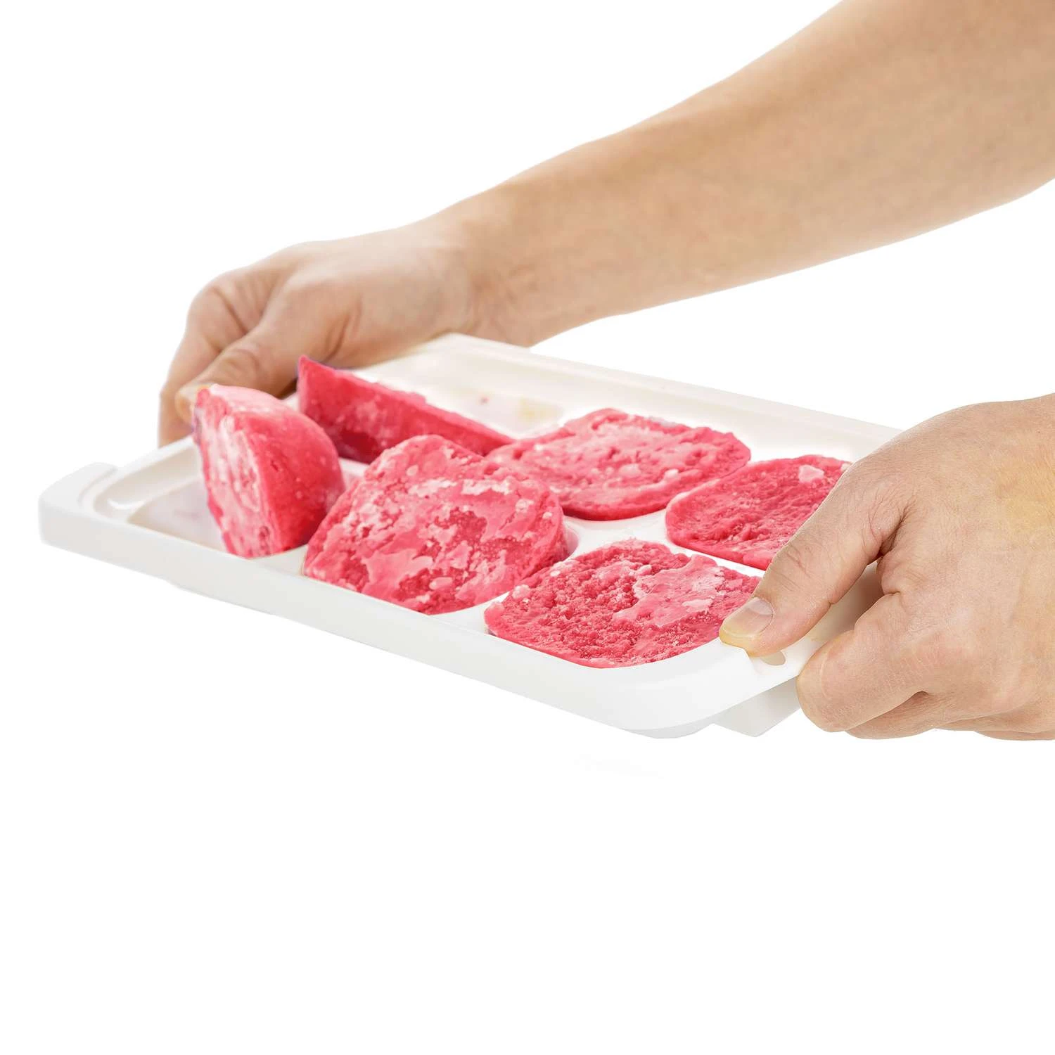 Twist the tray to pop out single or multiple frozen portions. Spill proof lid prevents leaks in the freezer and allows for easy stacking. Measurement indentation into contents. Silicone lid seals food to prevent freezer burn 6 – 1/2 cup servings per tray Silicone lid allows for expansion when freezing and reduces freezer burn Patent pending