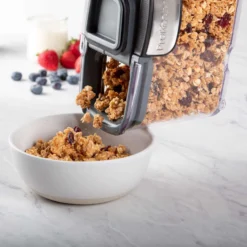 Airtight silicone seal keeps ingredients fresh longer. Stores a small box of cereal or 2 11 ounce granola bags. Contoured grip and wide mouth for easy one handed pouring. Easy to use Dishwasher safe and freezer safe BPA, lead, PVC and phthalate free