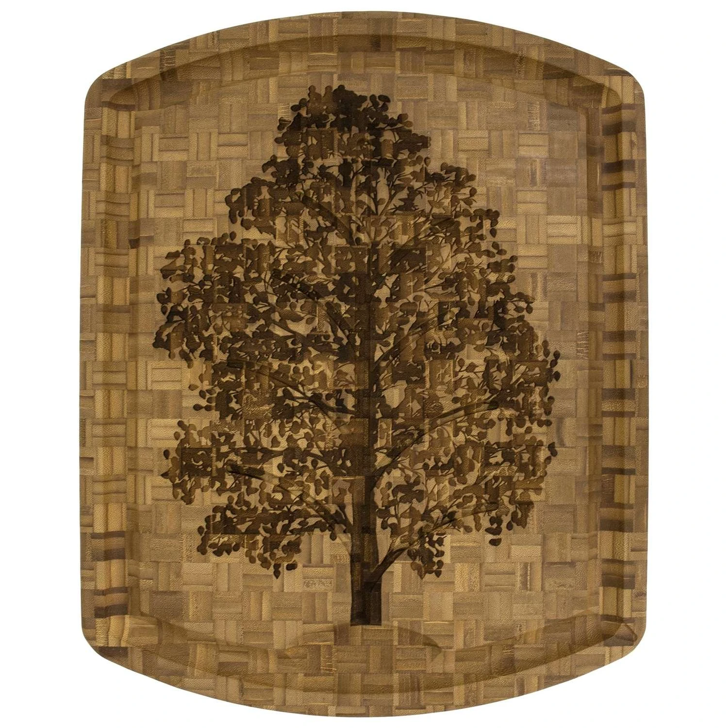 A beautiful marriage of form and functionality, the Totally Bamboo Family Tree Bamboo Carving Board with Etched Juice Groove is a gorgeous solution for carving and cutting. The etched tree in the center of the board directs juices away from food as it’s cut to the generous collection well. A deep groove runs along the interior edge of board to further collect and store and excess juice ensuring the table or countertop stay clean! Crafted with parquet end-grain bamboo, this board is gentle on knives while providing an outstanding cutting surface. When it’s time for cleanup, the board quickly wipes clean. Beautiful and functional gorgeous etched tree in the center of the board directs juices away from meat to the large collection well Slice into juicy meats or fruits while keeping the countertop and table clean deep groove runs along the interior edge of the board collect excess juices Parquet end-grain bamboo surface is outstanding for knives and provides an ideal cutting and chopping surface Easy care simply hand wash or wipe with a damp cloth do not soak in water or wash in the dishwasher Bamboo is better for the environment Moso bamboo is an incredibly durable material and it is a renewable resource which grows quickly and doesnt require pesticides, clear cutting, artificial irrigation or replanting