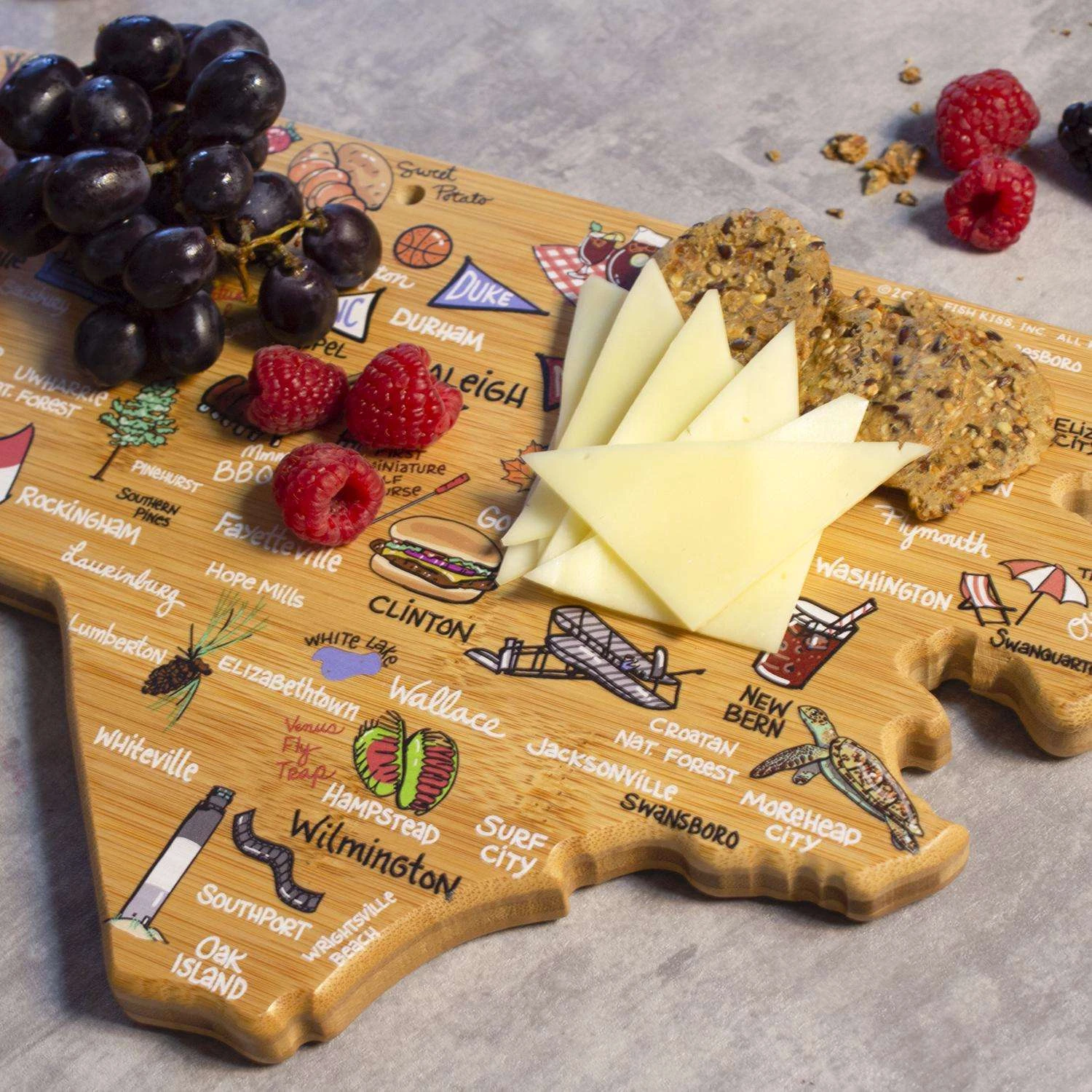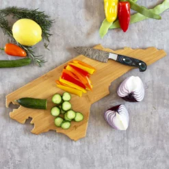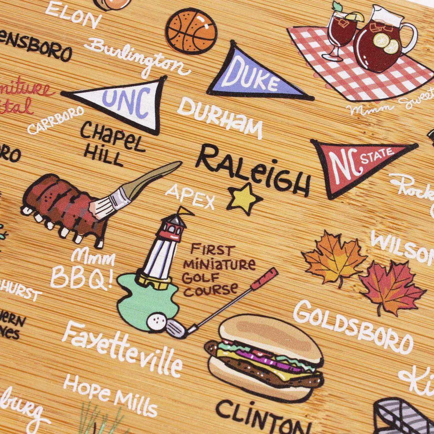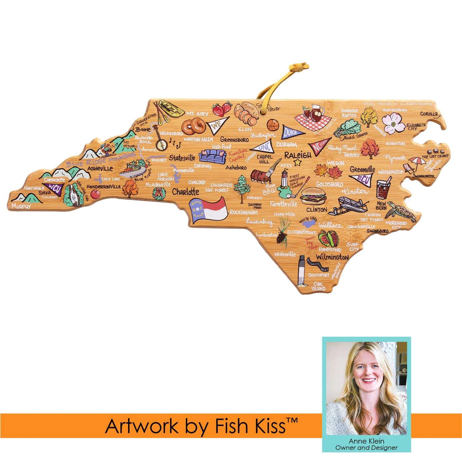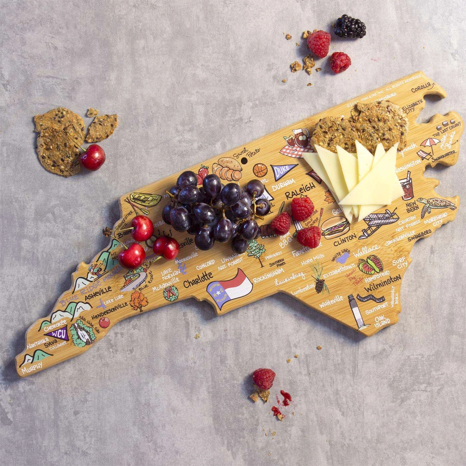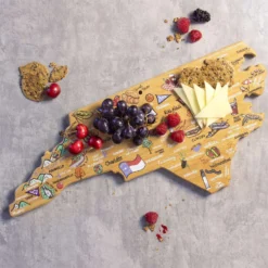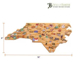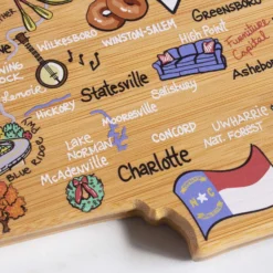 Celebrate life in The Tar Heel State with the Totally Bamboo North Carolina State Shaped Cutting Board with Artwork by Fish Kiss. This North Carolina shaped board features beautifully illustrated artwork by Fish Kiss artist Anne Klein of all the top towns and attractions in the state – see if you can find your home town! A fun and unique choice as a charcuterie board, you and your guests will love reminiscing about all of your favorite places featured on the board. Before serving, flip the board over for use as a knife-friendly bamboo chopping board on the blank back side. When not in use, the included hang tie allows the board to easily double as wall art. Show off your love of North Carolina in your kitchen, dining room, den or office. The North Carolina Cutting Board with Artwork by Fish Kiss is a great gift idea for anyone on your list that loves North Carolina. The artwork is applied using a specialized UV printing technique that’s safe for food contact and will maintain its beautiful color. Caring for the board is easy; simply hand wash with warm water and soap. Crafted in the shape of The Tar Heel State Features fun, colorful artwork by Fish Kiss artist Anne Klein A unique, conversation-starting charcuterie board Wonderful as wall art Do not soak or wash in the dishwasher Crafted from Natural, Sustainable Bamboo