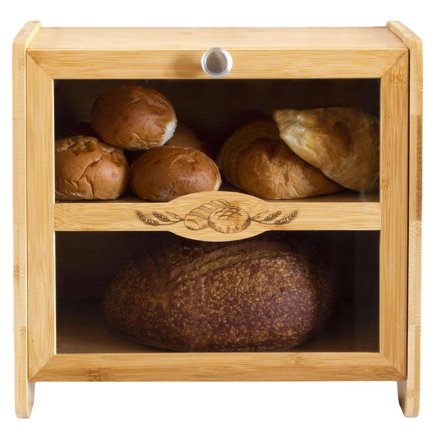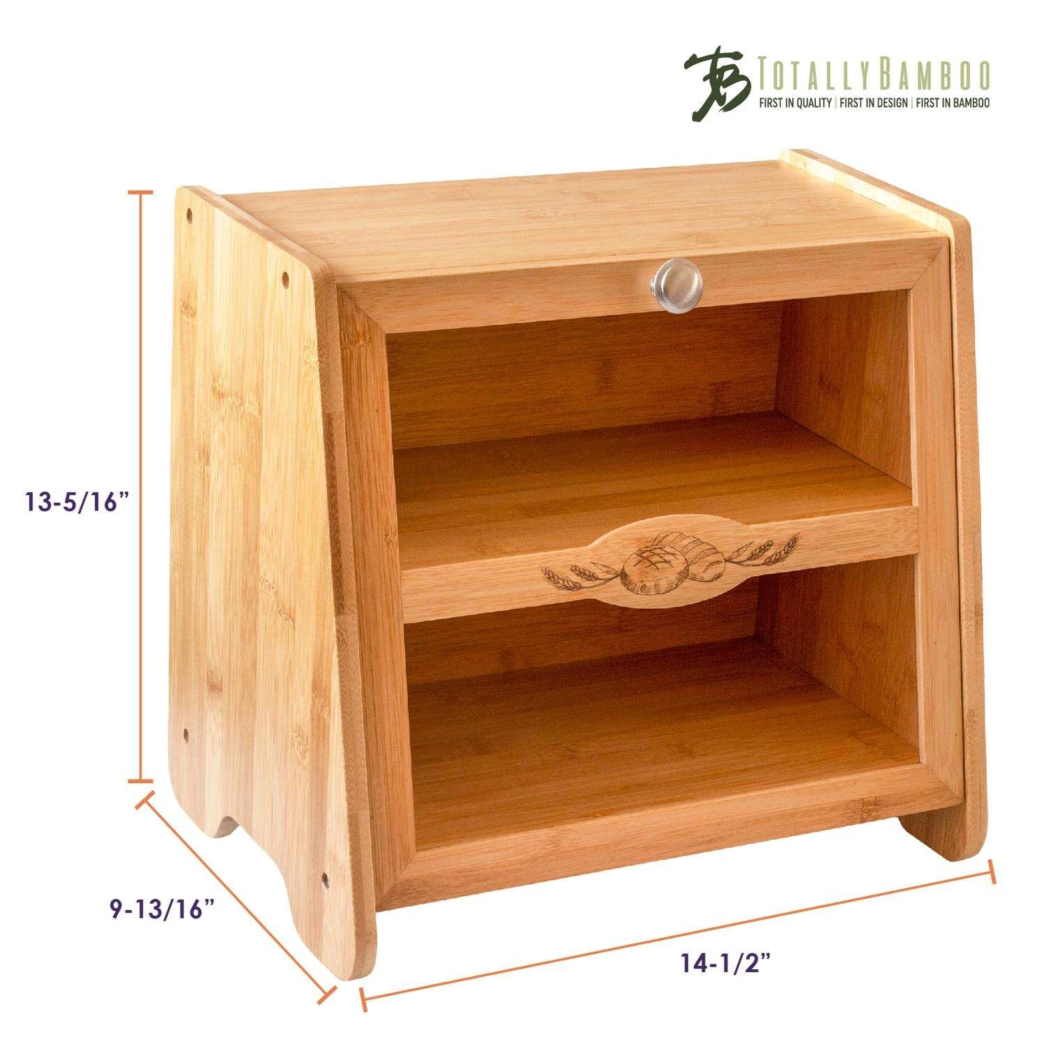 Conveniently store your bread while keeping it fresh with the Totally Bamboo Double-Layer Farmhouse Bread Box. This extra-large bread box includes two layers of storage space for loaves of bread, muffins, bagels, rolls, buns all of your favorite baked goods! The bread box is masterfully crafted from bamboo and features a rustic farmhouse design that looks at home in any kitchen. The large acrylic windows on each level of the bread box make it easy to see what’s inside at a glance. The door features a smartly designed magnetic lock that closes securely every time. The bread box also features a flat surface on the top for additional storage space for dry goods and spices in your kitchen. The Totally Bamboo Farmhouse Bread Box ships knocked down to keep its carbon footprint low and assembles in just a few minutes. Once assembled, the thick bamboo walls of the bread box create a sturdy and lasting storage solution and bamboo is a wonderful material to use, not only is it strong and sturdy but it’s a sustainable resource that quickly regrows once harvested. Care for the bread box is easy, simply wipe clean with a damp cloth. Extra large capacity: double compartment design offers a ton of storage space; perfect for loaves of bread, muffins, rolls, bagels and more Easy view windows: includes clear windows to easily see what’s in your bread box perfect for grabbing bread or bagels to toast in the morning before your coffee kicks in Sturdy bamboo construction: crafted from thick and durable pieces of moso bamboo Smart design: door features a magnetic lock that closes securely every time; flat top design offers additional storage space on top of the bread box Bamboo is an incredibly durable material and a renewable resource that regrows quickly after harvest